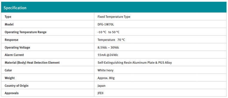 Máy dò nhiệt chống thấm nhiệt độ cố định DFG-1W70L bao gồm một đĩa bao gồm hai kim loại, với các hệ số giãn nở khác nhau đáng kể, được liên kết với nhau. Khi nhiệt độ môi trường vượt quá phạm vi nhiệt độ cố định của máy dò, đĩa lưỡng kim sẽ đưa các điểm tiếp xúc PGS (Platinum Gold Silver) tiếp xúc, thiết lập đoản mạch và kích hoạt báo động. Khi nhiệt độ giảm, đĩa lưỡng kim trở lại hình dạng ban đầu và tiếp xúc mở ra. Một đèn LED xây dựng trong con dấu cung cấp một dấu hiệu trực quan về tình trạng báo động.